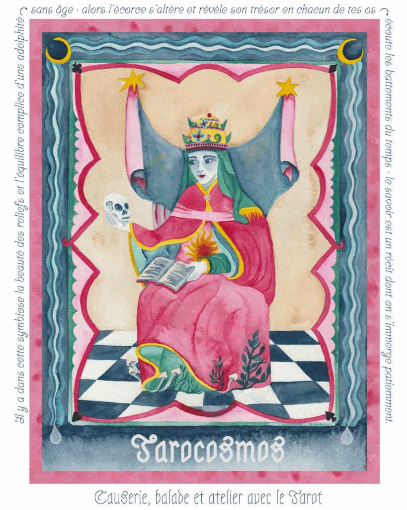 Cartes à jouer ou jeu de miroir, le tarot fait lien : il invite à l’exploration de soi et aux relations que nous tissons dans le monde. À l’occasion de trois rencontres, je vous propose d’approcher le tarot de trois manières : une causerie, une balade et un atelier créatif. Chacune d’elle présente un atout, un arcane majeur en lien avec la saison et les imaginaires qui l’accompagnent. C’est un regard personnel et créatif du Tarot de Marseille. Je m’adresse aux esprits curieux comme aux initiés.